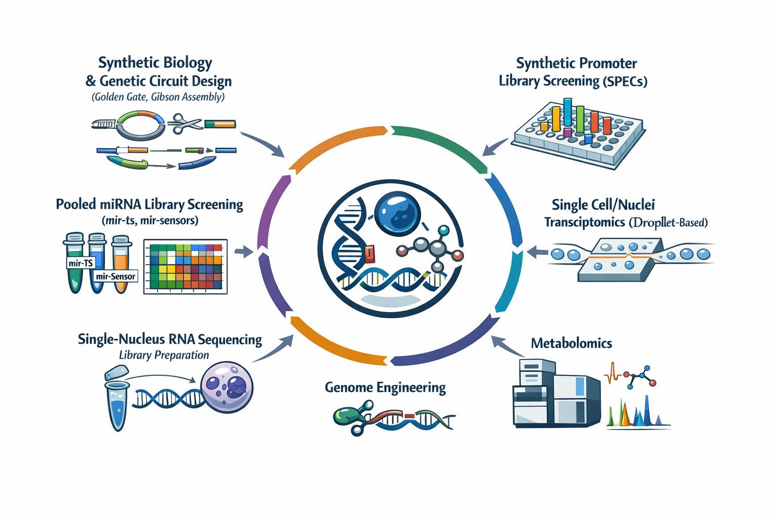 promoter library screening (SPECs), Pooled miRNA library screening (mir-ts, mir-sensors), Genome engineering,